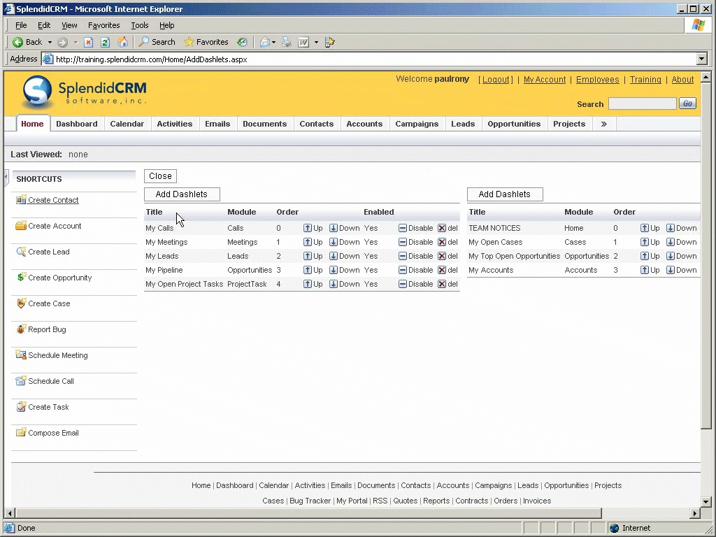 The SplendidCRM home page is driven by a number of little dashboard controls.These controls can be added, removed and customized by each user.